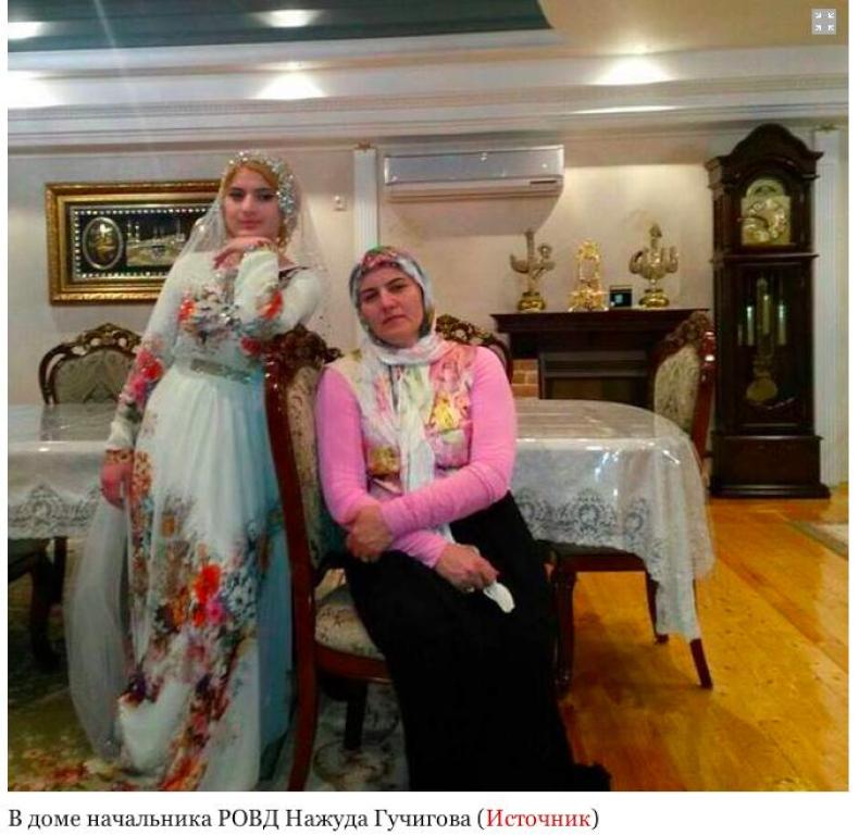 2. О многоженстве. Судя по всему, первая жена Гучигова никуда не делась. Она осталась проживать в доме Гучигова. Если брак с ней действительно не был официально зарегистрирован, то и талак (развод по нормам шариата) ей тоже дан не был. Обратите внимание, на фотографиях обе жены - старшая и младшая вместе и в день свадьбы, и на следующий день в доме Гучигова, еще на одной фотографии Гучигов с женой (тогда еще единственной) и сыном полгода назад. Думаю, если бы не шум в СМИ, то и с Хедой официально брак не регистрировался бы. Но как бы то ни было, по факту у полковника МВД Гучигова теперь две жены.