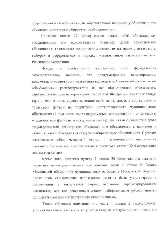 Представляется также важным, чтобы соответствующие изменения были внесены и в Закон Московской области «О выборах Губернатора Московской области» от 6 июля 2012 года №98/2012-ОЗ изменение. В частности, пункт 9 статьи 18 может быть дополнен абзацем вторым следующего содержания: «Наблюдатели могут быть также назначены общественными объединениями, уставные цели которых предусматривают наблюдение за проведением выборов».
