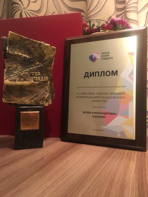 Член Совета при Президенте Российской Федерации по развитию гражданского общества и правам человека, председатель Комитета против пыток Игорь Каляпин стал лауреатом премии имени Егора Гайдара в этом году. Торжественная церемония награждения состоялась накануне вечером в Театре Наций.