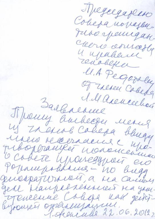 С согласия членов Совета Людмилы Алексеевой, Валентина Гефтера и Бориса Пустынцева на сайте опубликованы заявления о их выходе из состава Совета.