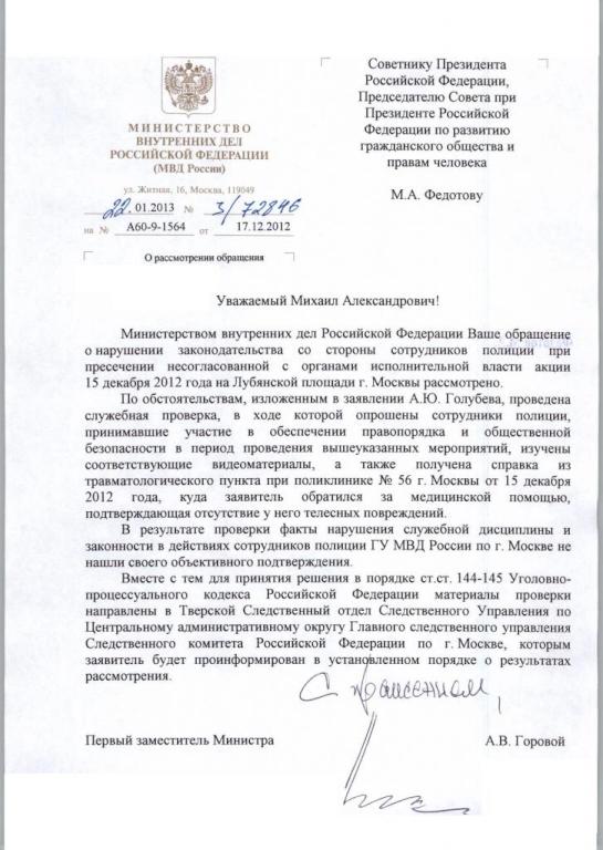 В Совет поступил ответ МВД России на обращение в защиту прав журналиста А.Ю. Голубева